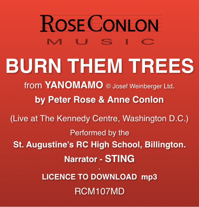 RCM107MD Burn Them Trees from Yanomamo (live in The Kennedy Centre, Washington DC) by Peter Rose & Anne Conlon © Josef Weinberger Ltd, London. The remarkable Choir and Musicians of St Augustine's RC High School, Billington.