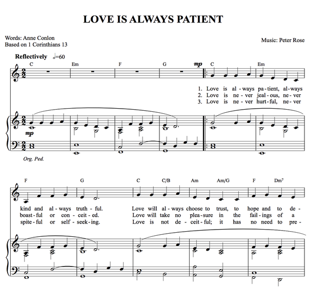 RCM2027PD: License to download and print a single PDF copy of the piano vocal score of LOVE IS ALWAYS PATIENT by Peter Rose and Anne Conlon. After purchasing, please email us at p.rose82@btinternet.com with the name of the person for whom this is intended so that license details can be printed on the music.